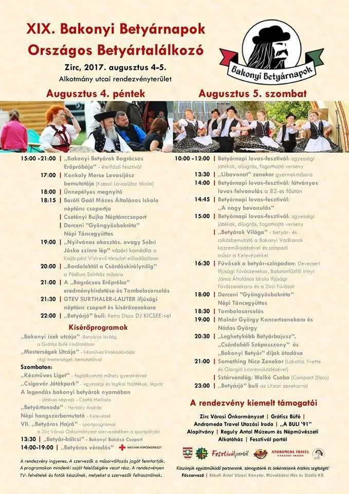 A rendezvény idén is a „Bakonyi Betyárok Bográcsos Erőpróbájával” veszi kezdetét, hiszen egy igazi betyár és csárdabéli szépasszony üres bendővel nem indul neki az előtte álló hosszú, eseménydúsnak ígérkező betyárkodásnak. „Betyárjó” színpadi produkciók várják a közönséget: a néptánccsoportok dobogó csizmáinak ritmusa és suhogó szoknyái, a népzene, a könnyűzene, a szórakoztató műfaj népszerű zenekarai, előadói, tehetséges fiatalok lendületes produkciói és „Sztárok a betyárok között” képviseltetik magukat a színpadon. Kicsi és nagy egyaránt aktívan kiveheti részét a betyárkodásból: a gyermekeket „Betyártanoda”, zenés-játékos műsorok, játszóház, kézműves liget, népi játékpark várja. Hagyományőrző betyárcsoportok a betyárvilág korhű felidézésével és bemutatókkal hangolnak az esti mulatságokra. A szombati program egyik leglátványosabb eleme a várost átszelő 82-es főúton áthaladó, ostorcsattogtatással és muzsikaszóval kísért lovas, fogatos, betyáros felvonulás. A Betyárnapi lovas-fesztiválon kezdő és haladó lovasok ügyességi versenyei és a fogathajtók versenyei várják a közönséget. Közben „Betyáros Hajrá!” mottóval sportversenyek is színesítik a programkínálatot: Bakonyi Betyárkupa kispályás labdarúgó torna, nyílt lövészverseny, Öregfiúk labdarúgó mérkőzés és „Batyuval szemben a kapuval” tizenegyesrúgó-verseny. Minden évben avatunk újabb Bakonyi betyárokat és csárdabéli szépasszonyokat, díjazzuk a Leghetykébb betyárbajusz gazdáját, és mindkét este „Betyárjó buli” zárja a rendezvényt. 2017-ben is tartalmas percekkel töltjük meg a képzeletbeli betyárbatyut, kicsik és nagyok betyáros jókedvéről gondoskodunk, mert remek hangulatú, közös vigasságokból idén sem lesz hiány!