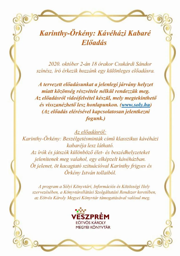 Most Sóly.hu hivatalos facebook oldalán rögzített, de élő formában nézhetjük meg az előadást, 2020.10.12-én /hétfő/ este 8 órától, melyet a jelenlegi járvány helyzet miatt közönség részvétele nélkül adtak elő a 2020. október 2-án.