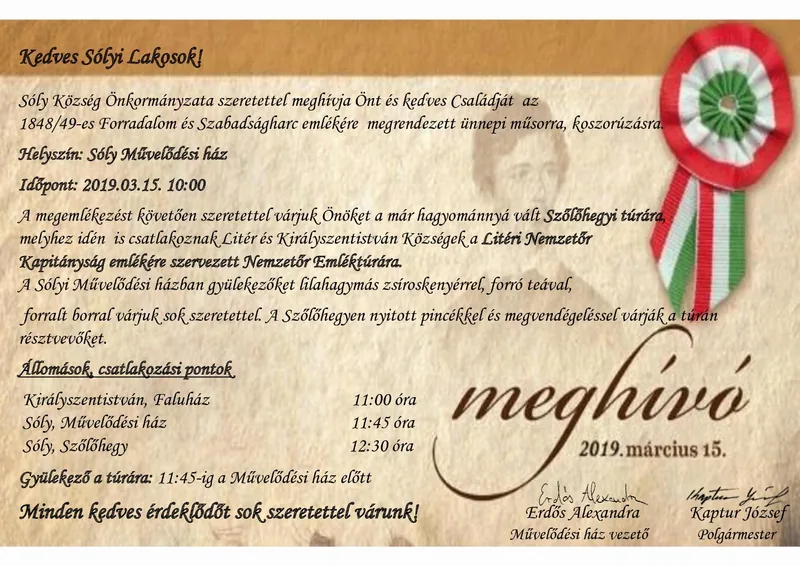 Sóly Község Önkormányzata szeretettel meghívja Önt és kedves Családját az 1848/49-es Forradalom és Szabadságharc emlékére megrendezett ünnepi műsorra, koszorúzásra.