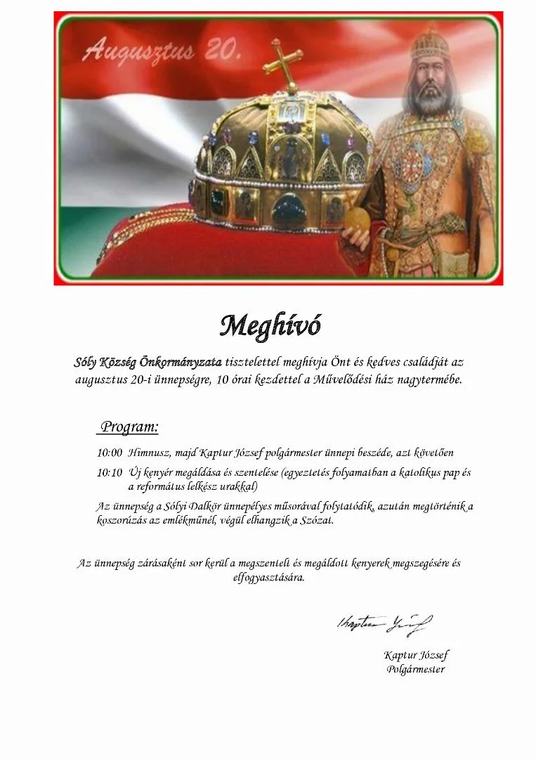 Sóly Község Önkormányzata tisztelettel meghívja Önt és kedves családját az augusztus 20-i ünnepségre, 10 órai kezdettel a Művelődési ház nagytermébe.