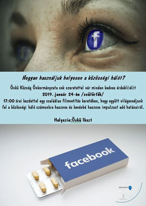 Öskü Község Önkormányzata szeretettel vár minden kedves érdeklődőt 2019. január 24-én /csütörtök/ 17:00 órai kezdettel egy családias filmvetítés keretében, hogy együtt világosodjunk fel a közösségi háló számunkra hasznos és kevésbé hasznos impulzust adó hatásairól.