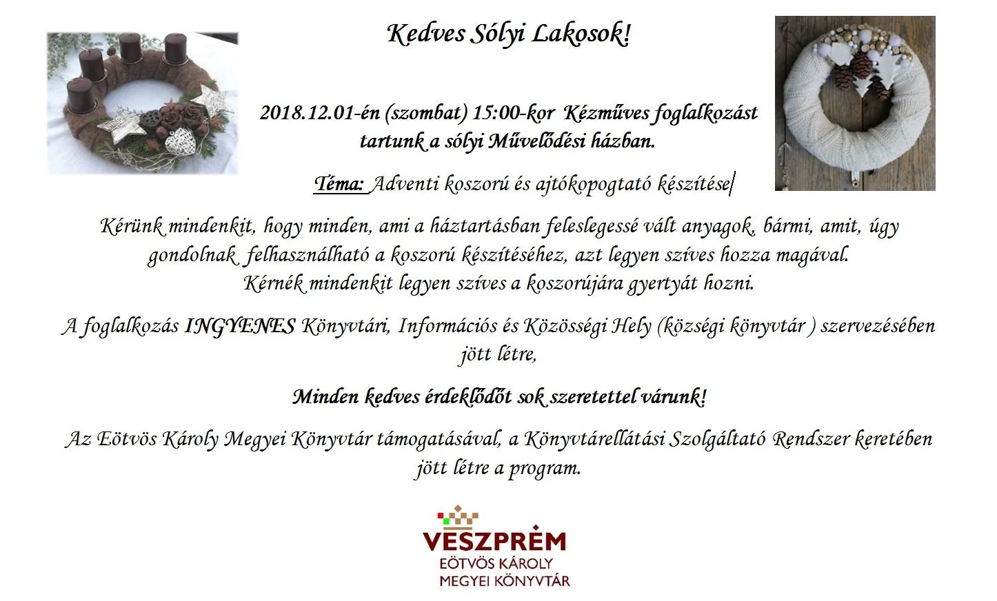 2018.12.01-én (szombat) 15:00-kor Kézműves foglalkozást tartunk a sólyi Művelődési házban.