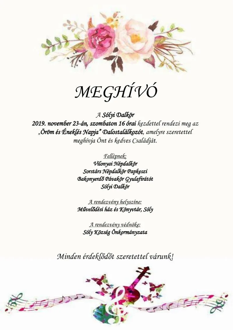 2019. november 23-án, szombaton 16 órai kezdettel rendezi meg az „Öröm és Éneklés Napja” Dalostalálkozót, amelyre szeretettel meghívja Önt és kedves Családját.