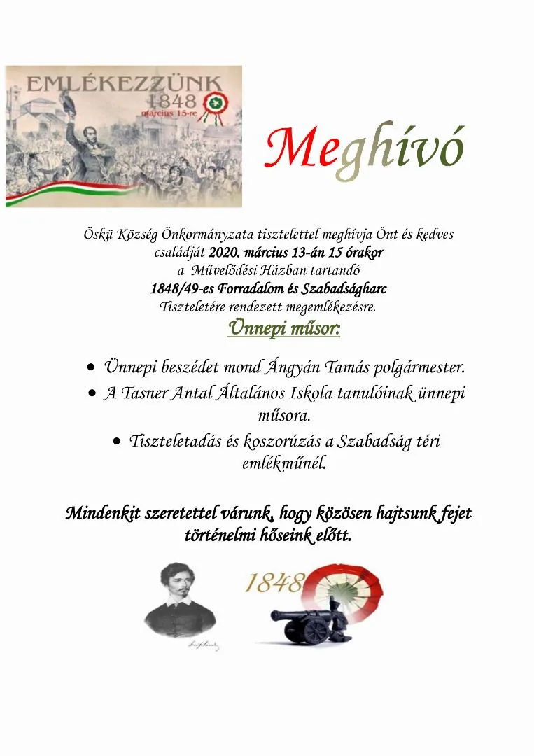 Öskü Község Önkormányzata tisztelettel meghívja Önt és kedves családját 2020. március 13-án 15 órakor