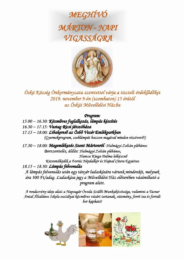 - A lámpás felvonulás után egy tányér ludaskására várunk mindenkit, melynek ára 300 Ft/adag. Ludaskása jegy a Művelődési Ház előterében vásárolható a program alatt.