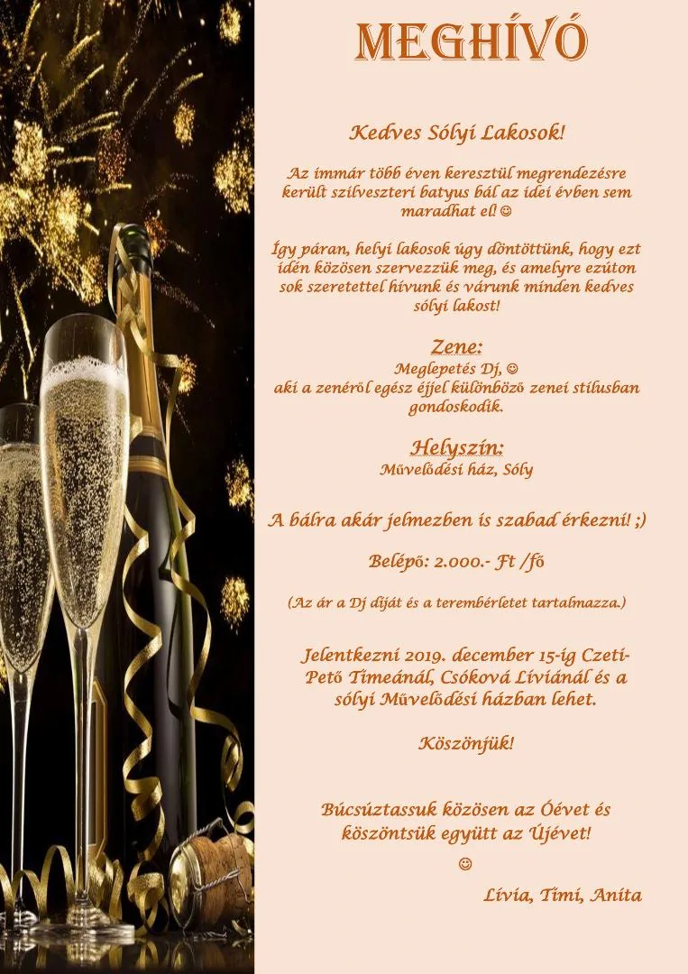 Az immár több éven keresztül megrendezésre került szilveszteri batyus bál az idei évben sem maradhat el! J