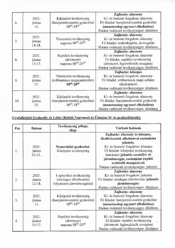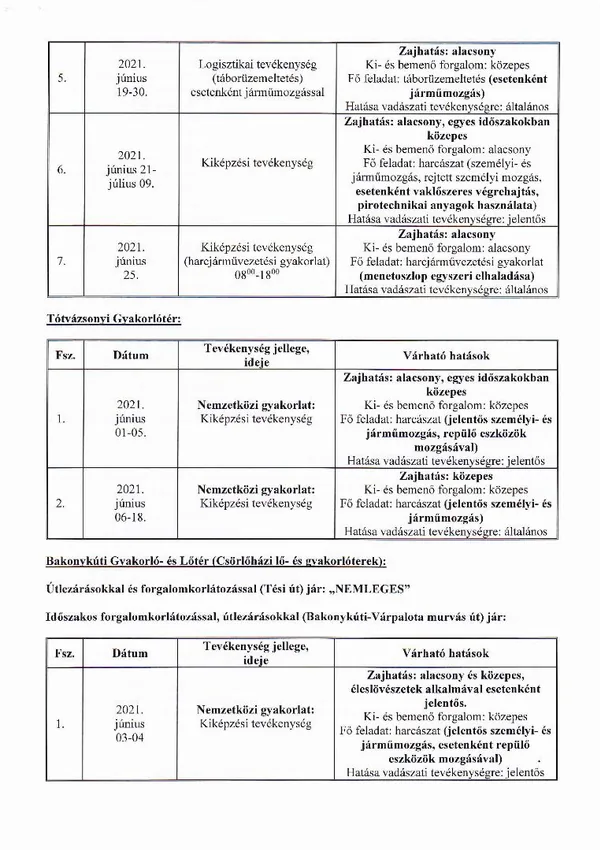 BAKONY HARCKIKÉPZŐ KÖZPONT honvédségi területein az éleslövészetek és egyéb katonai tevékenységek alakulása.