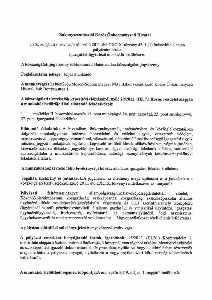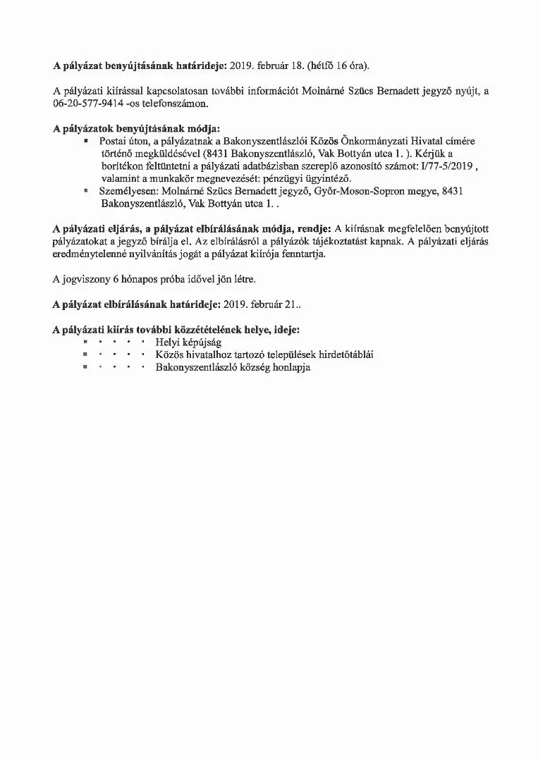 Bakonybél község önkormányzata pályázatot hirdet mezőőri/falugondnok munkakör betöltésére.