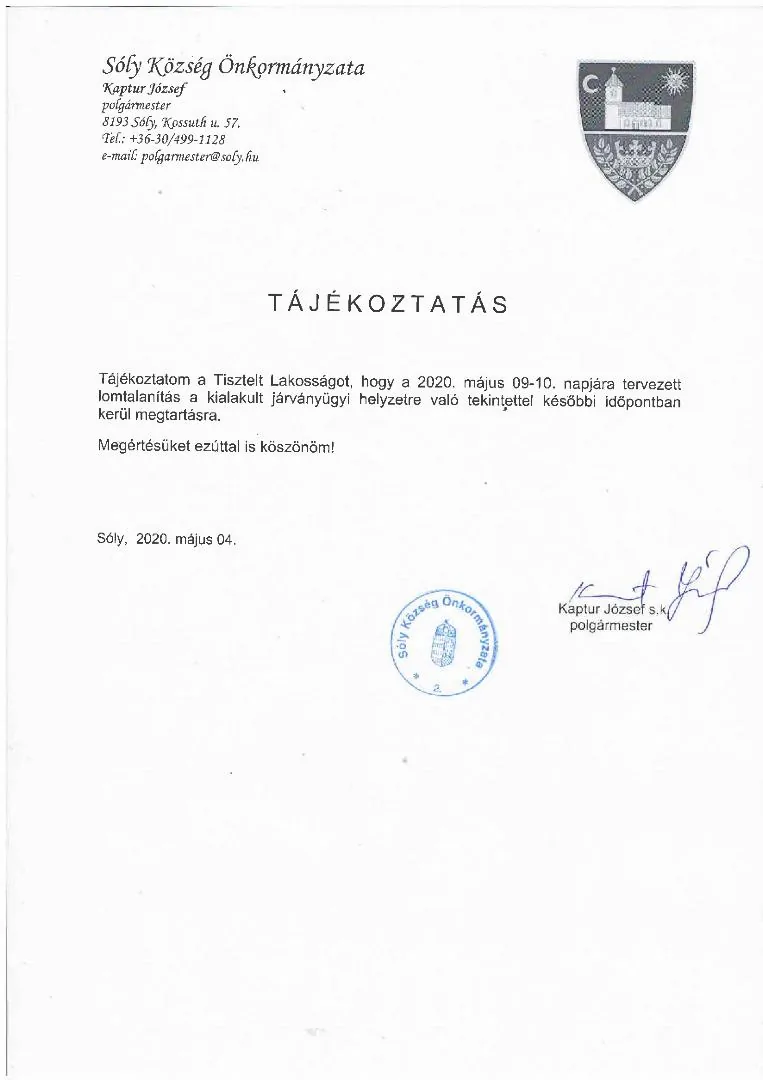 Tájékoztatjuk a Tisztelt Lakosságot