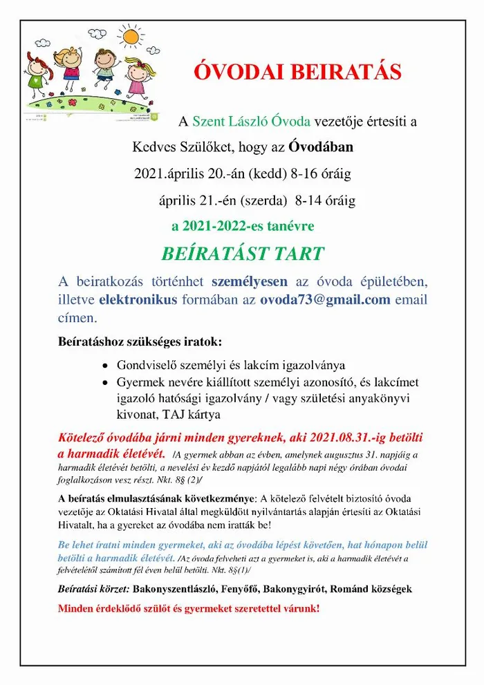 A beiratkozás történhet személyesen az óvodaépületében, illetve elektronikus formában az ovoda73@gmail.com email címen.