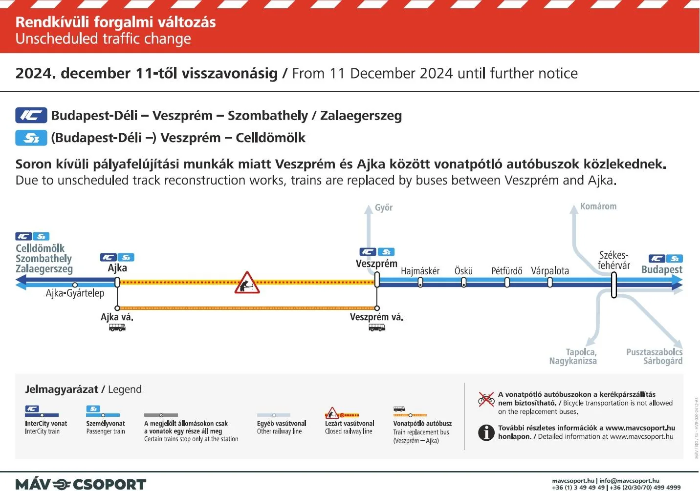 Ez idő alatt a Veszprém–Ajka szakaszon vonatpótló autóbuszok szállítják az utasokat. A BAKONY, GÖCSEJ és CITADELLA InterCity vonatok Budapest felől Veszprémig, illetve Szombathely és Zalaegerszeg felől Ajkáig közlekednek. A többlet átszállás időigénye, valamint a vonatpótló autóbuszok hosszabb menettartama a közút forgalmától függően a vonatoknál 5-15 perc közötti késést okoz. A vonatpótló autóbuszok az átszállást követően azonnal indulnak Veszprémből Ajkára, és Ajkáról Veszprémbe. A vonatok Veszprém és Ajka állomásokon megvárják az autóbuszok érkezését. A földi és fedélzeti utastájékoztatást számos dolgozó segíti. A MÁV-START Zrt. munkatársai Székesfehérvár, Veszprém és Ajka állomásokon segítik az utasok tájékoztatását. Az elektronikus utastájékoztatási és értékesítési csatornákon 2024. december 12-től a vonatpótló autóbuszok közlekedése megjelenítésre került.