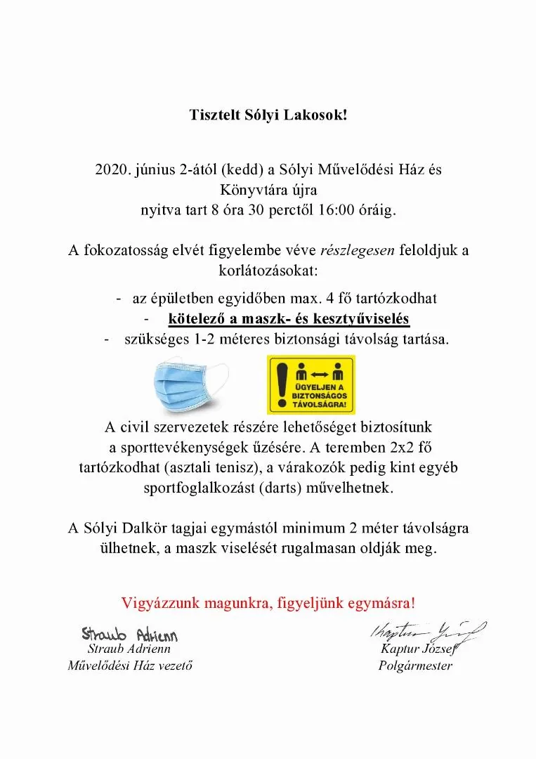2020. június 2-ától (kedd) a Sólyi Művelődési Ház és Könyvtára újra