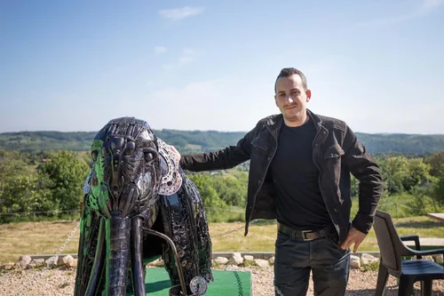 - Az egyik megrendelőm Cseszneken vendéglátóegységet működtet. Étterme előtt az egyik fabódéban fagyizó, a másikban limonádézó van. Utóbbinak a kabalája a mamutka. Ezért kért eléje egy mamutszobrot. Így most már pár napja ott áll a turistacsalogató látványosság falunk főutcája mellett, a vár közelében. Aki átutazik a településen vagy kirándulni jön ide, biztosan észreveszi. A legtöbbeknek először eláll tőle a szavuk, utána mosolyt csal az arcukra. Felfedezhetnek a szobor alkotóelemei között szódáspatronokat, régi szerszámokat, háztartási eszközöket, evőeszközöket is – sorolta az alkotó és hozzátette: először a drótvázát készítette el a csaknem másfél méter magas, tervezőjének a derekáig érő szobornak. Ehhez csöveket is használt. Majd erre építette rá a többi fémhulladékot, a mamutokról talált képek alapján. Két hónap alatt százhúsz munkaórát fordított erre. Élvezte a feladatot, aminek az eredménye kétmázsás lett.”- írta Zoltánról a Veszprém megyei Napló.