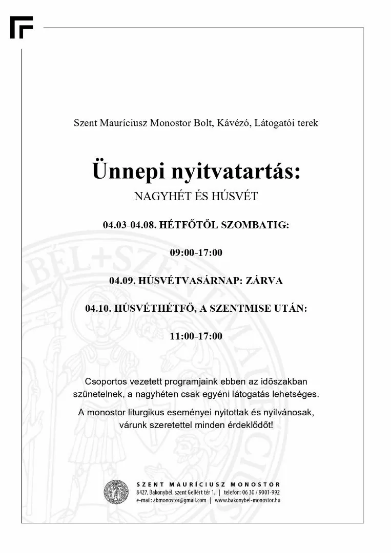 Szent Mauríciusz Monostor Bakonybél ünnepi nyitvatartása