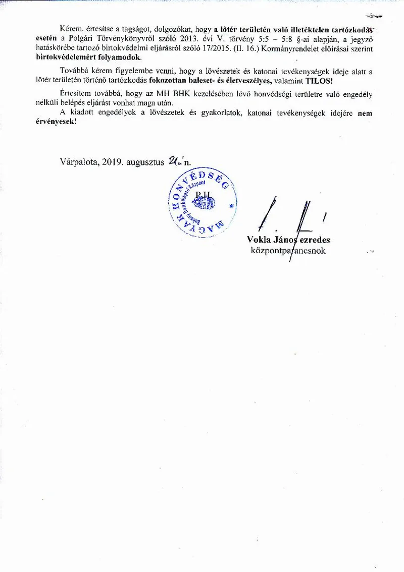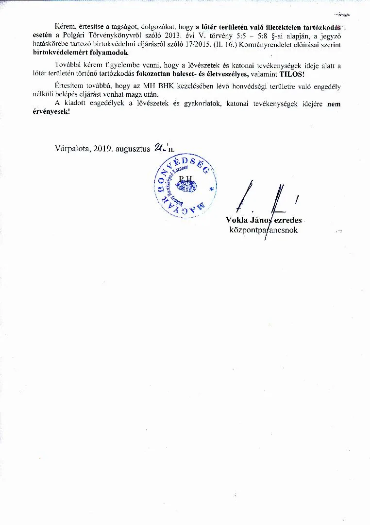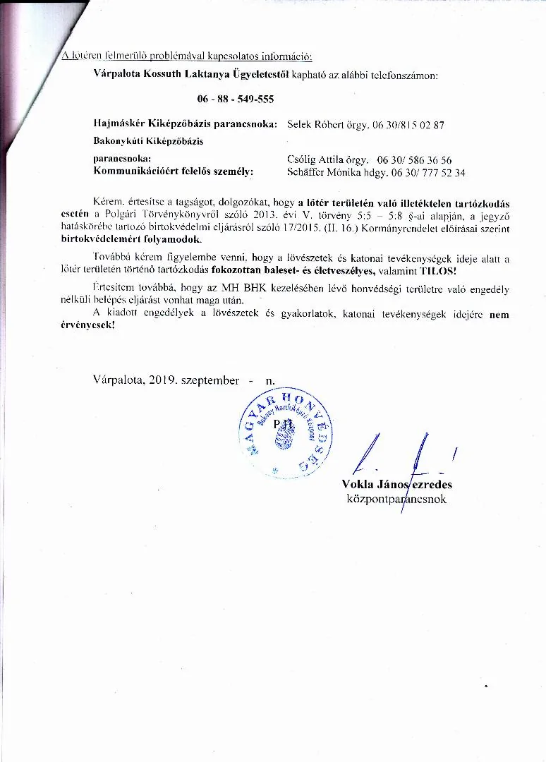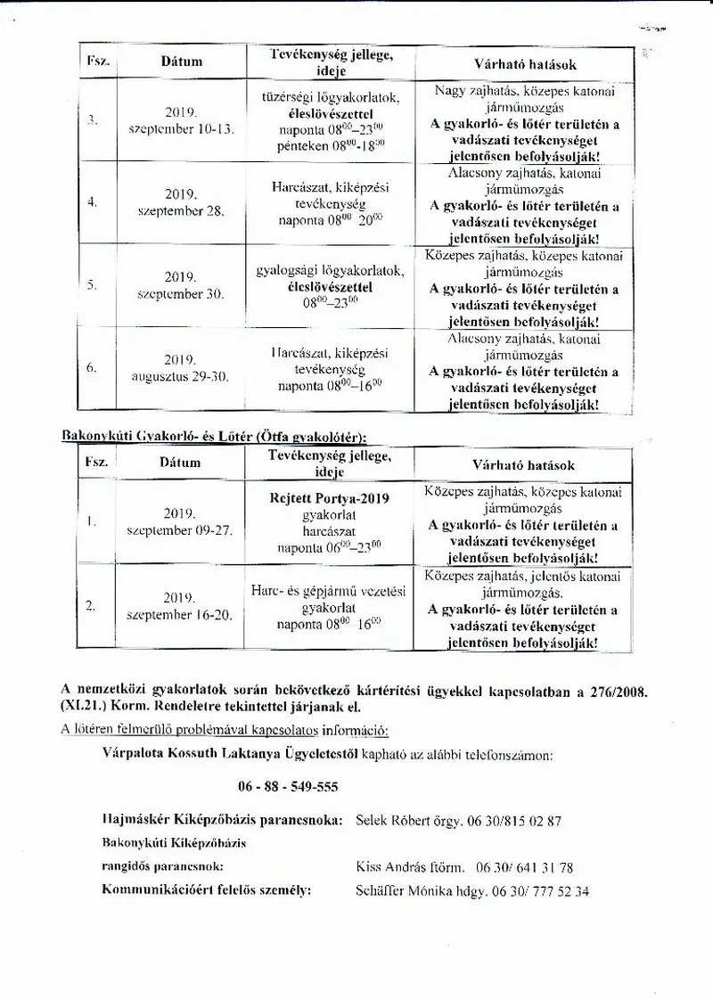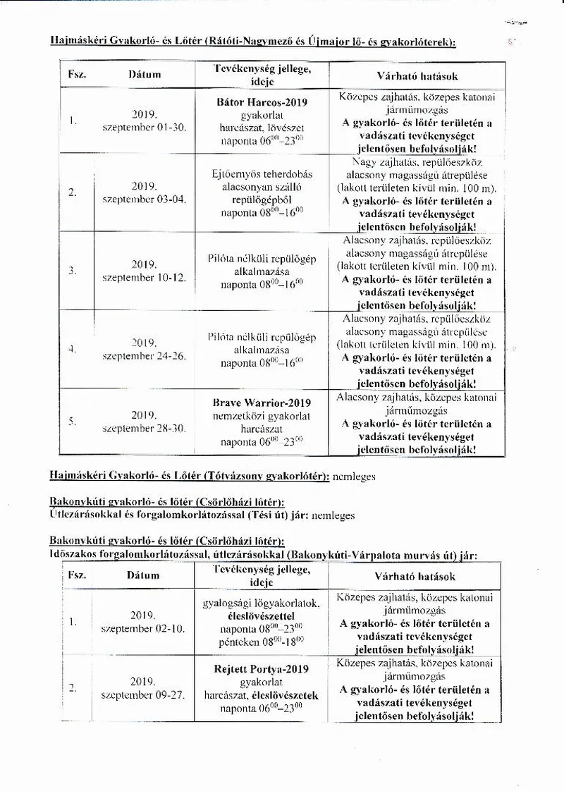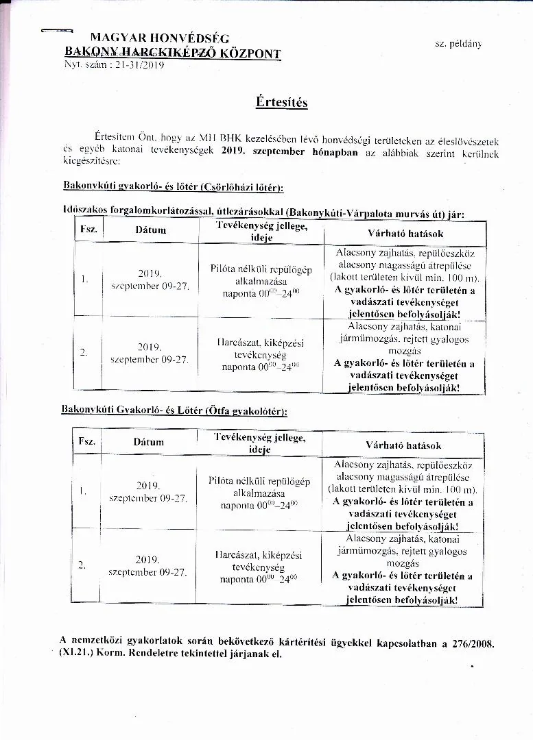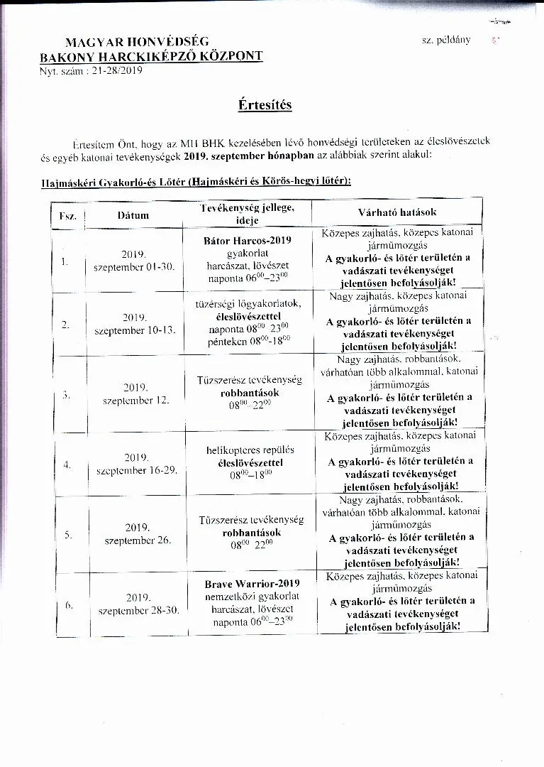 BAKONY HARCKIKÉPZŐ KÖZPONT honvédségi területein az éleslövészetek és egyéb katonai tevékenységek alakulása.