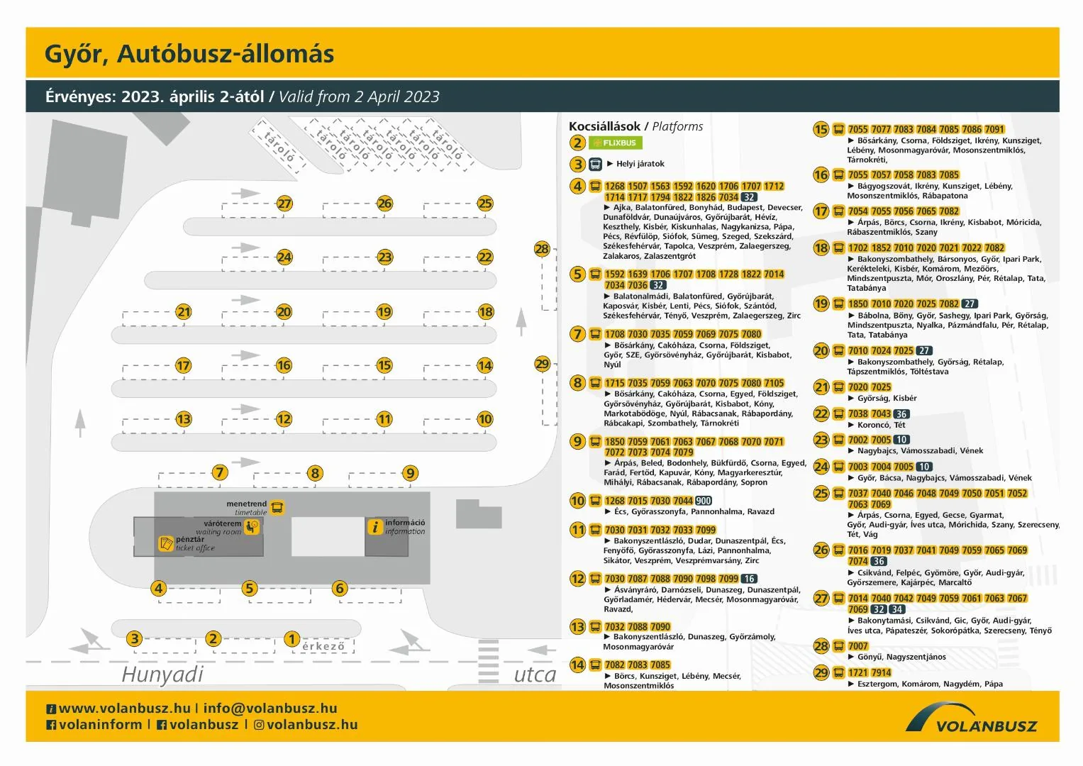 2023. április 2-ától (vasárnaptól) Győr, Autóbusz-állomás kocsiállásainak rendje átalakul. A jövőben több kocsiállásról indulnak autóbuszok. A részleteket az alábbi ábrán láthatják.