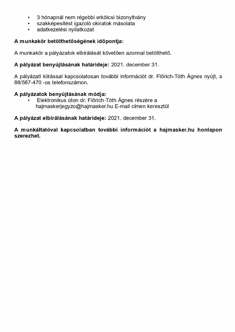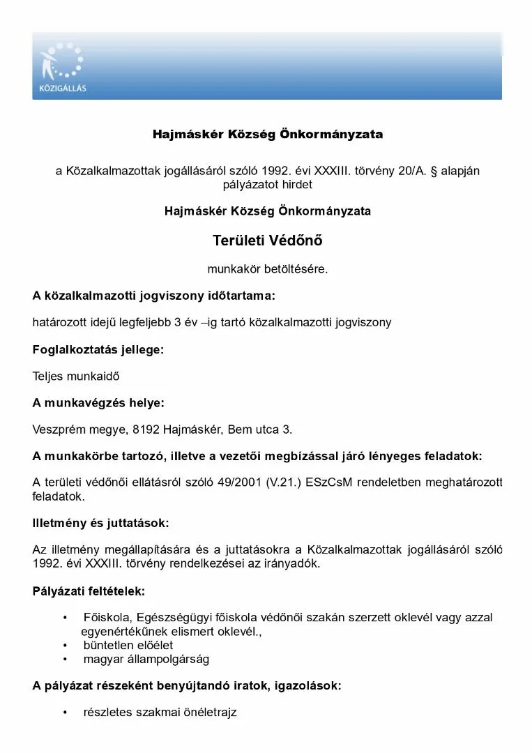 Munkavégzés helye: Veszprém megye, Hajmáskér Bem u.3.