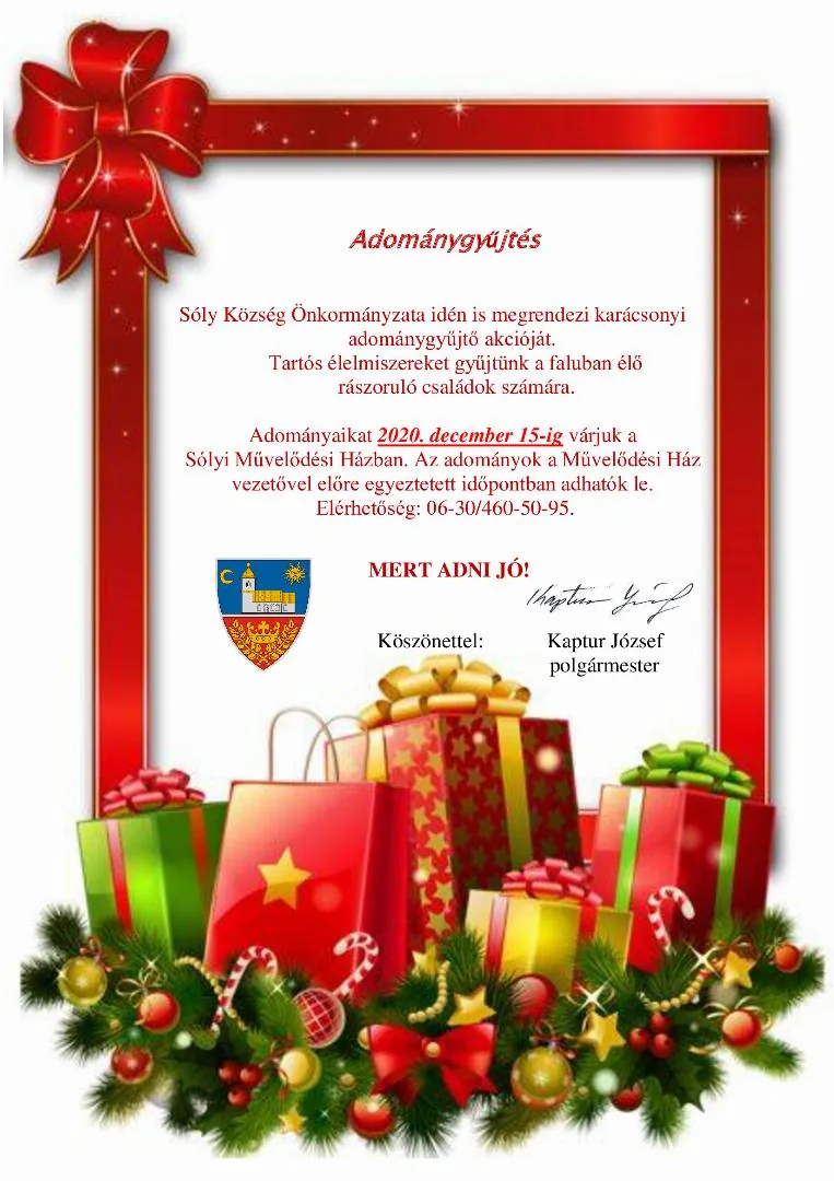 Sóly Község Önkormányzata idén is megrendezi karácsonyi adománygyűjtő akcióját.