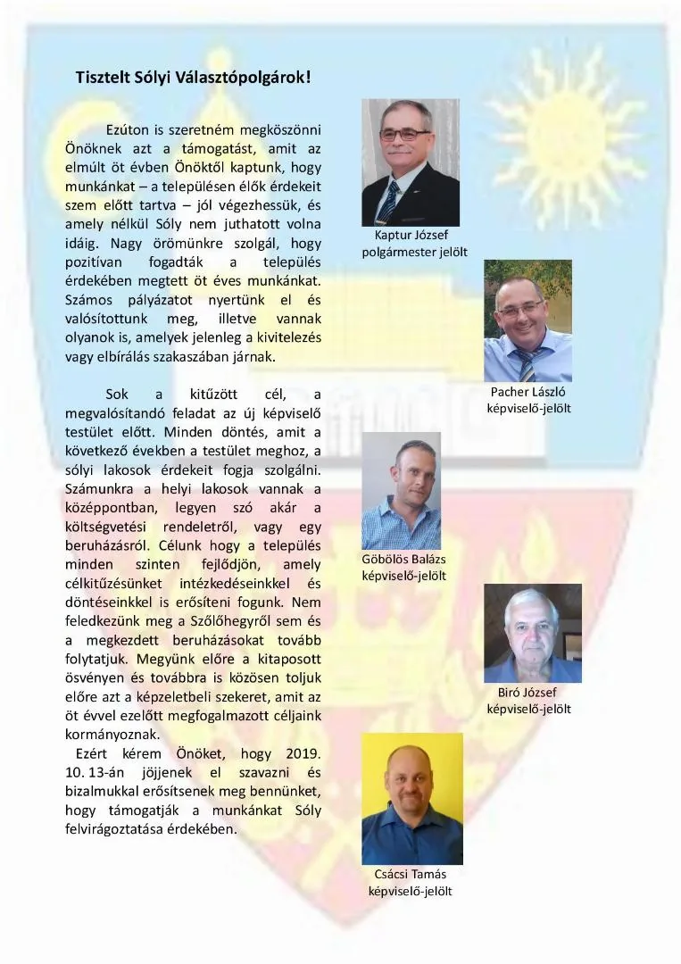 Ezért kérem Önöket, hogy 2019. 10. 13-án jöjjenek el szavazni és bizalmukkal erősítsenek meg bennünket, hogy támogatják a munkánkat Sóly felvirágoztatása érdekében.