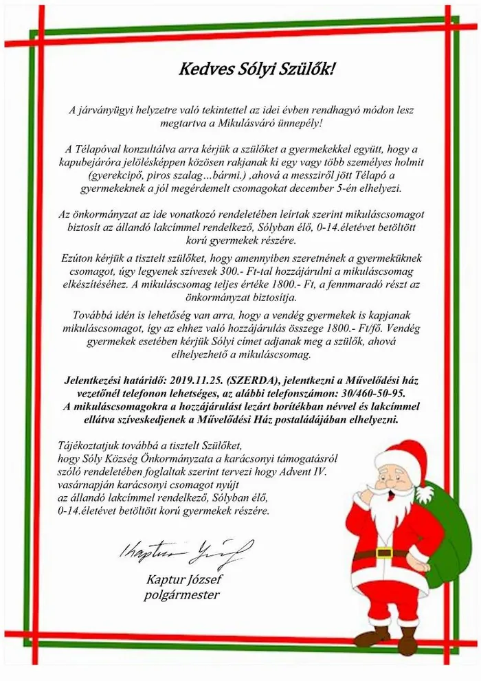 A mikuláscsomagokra a hozzájárulást lezárt borítékban névvel és lakcímmel ellátva szíveskedjenek a Művelődési Ház postaládájában elhelyezni.