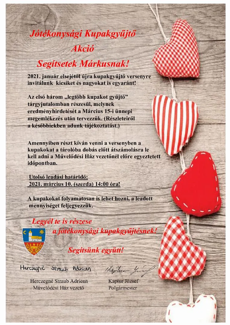 Utolsó leadási határidő: 2021. március 10. (szerda) 14:00 óra! A kupakokat folyamatosan is lehet hozni, a leadott mennyiséget feljegyezzük.
