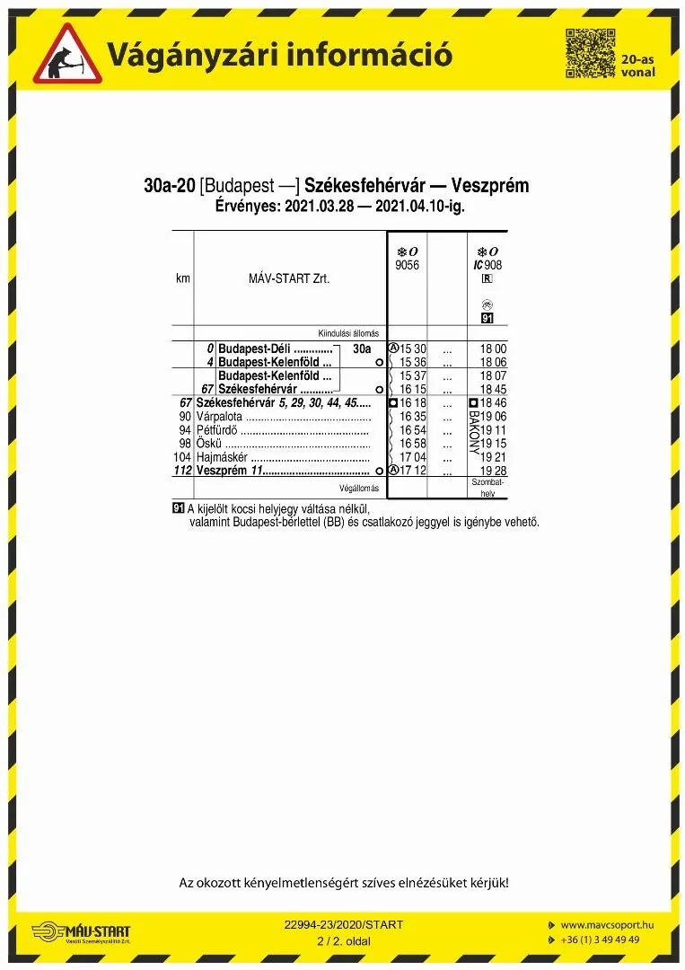 20 Székesfehérvár - Veszprém vasútvonalon egyes vonatok módosított menetrend szerint közlekedik. A 9056 sz. vonat munkanapokon Budapest-Déli – Székesfehérvár – Veszprém viszonylatban közlekedik.