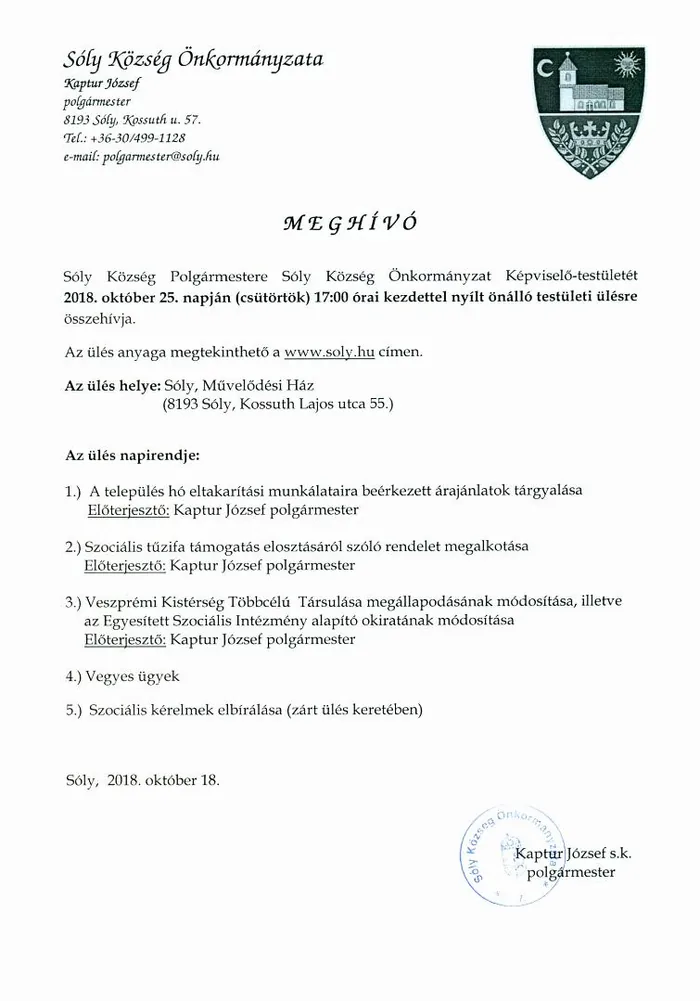Sóly Község Polgármestere Sóly Község Önkormányzat Képviselő-testületét 2018. 10. 25. napján (csütörtök) 17:00 órai kezdettel nyílt önálló testületi ülésre összehívja.
