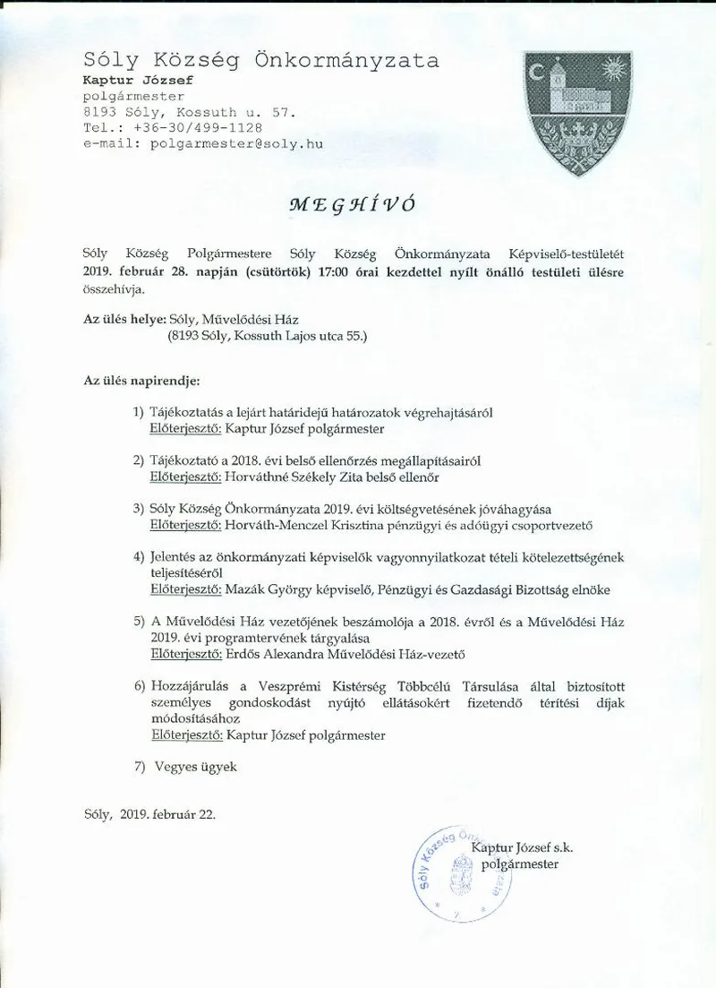 2019. február 28. napján (csütörtök) 17:00 órai kezdettel nyílt önálló testületi ülésre összehívja.