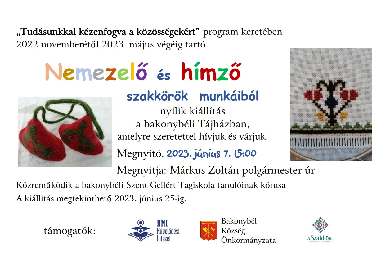 Nemezelő és hímző szakkörök munkáiból nyílik kiállítás a Bakonybéli Tájházban, amelyre szeretettel hívjuk és várjuk.