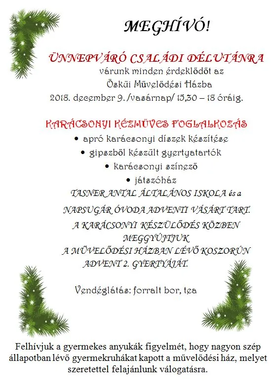 Ünnepi családi Délutánra várunk minden érdeklődőt az Ösküi Művelődési Házba