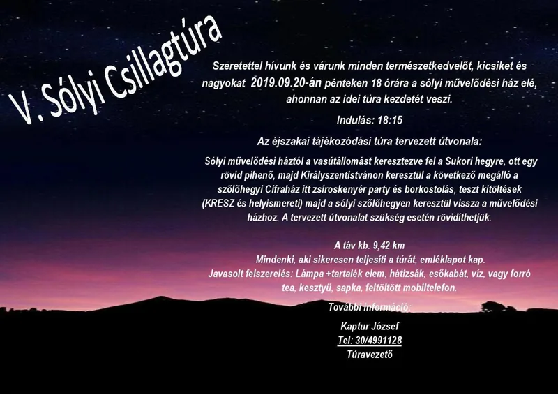Szeretettel hívunk és várunk minden természet kedvelőt, kicsiket és nagyokat 2019.09.20-én péntek 18 órára a sólyi művelődési ház elé,