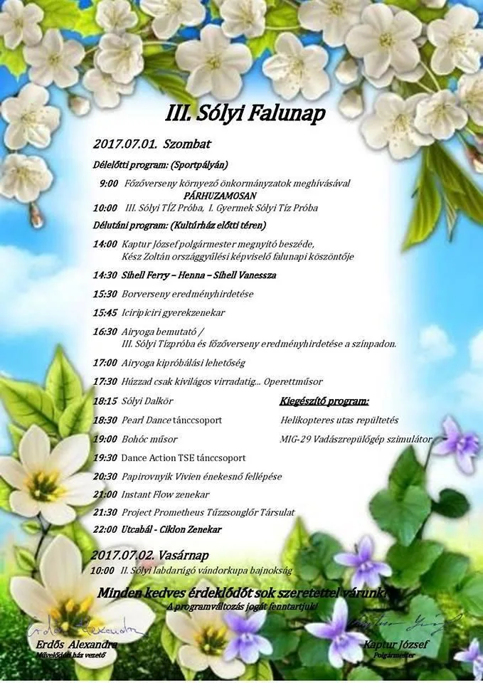 Összességében kiválóan sikerült a III. Sólyi Falunap. A résztvevők példát mutattak a közösségi élet íratlan szabályaiból és nem utolsó sorban a szabadidő hasznos és kulturált eltöltésének a lehetőségéről.