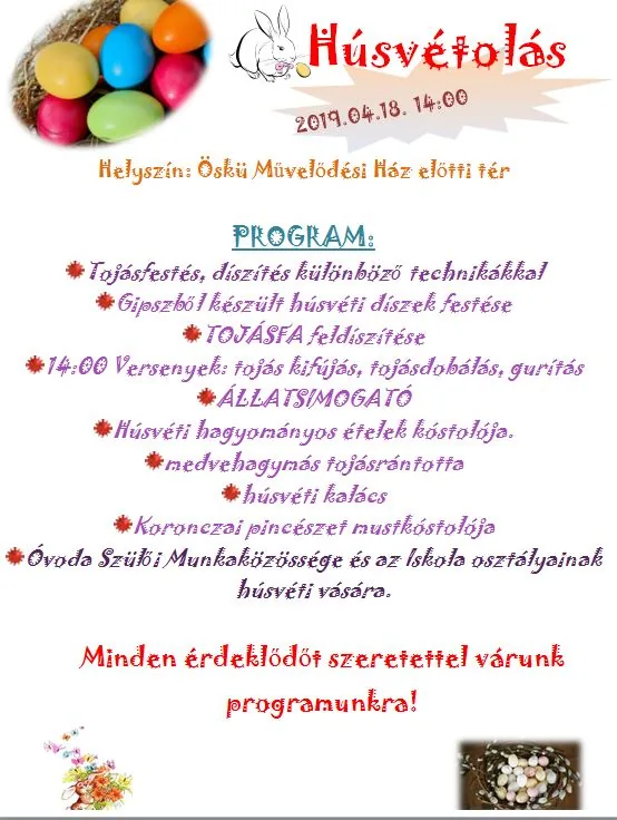 - 14:00 Versenyek: tojás kifújás, tojásdobálás, gurítás