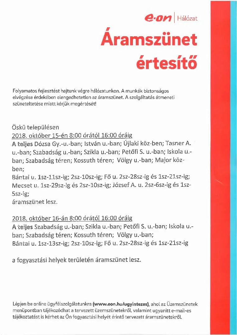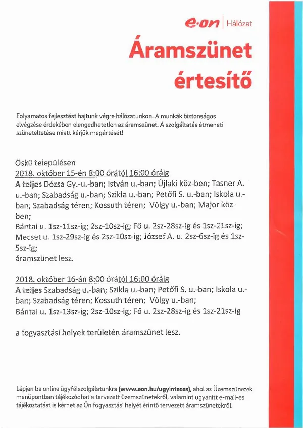 Folyamatos fejlesztést hajtunk végre hálózatunkon. A munkák biztonságos elvégzése érdekében elengedhetetlen az áramszünet. A szolgáltatás átmeneti szüneteltetése miatt kérjük megértését!