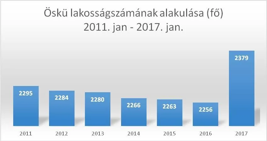 A 2011. január – 2015. december közötti időszakban stagnálás, kismértékű, de folyamatos csökkenést mutatott a lakosságszám, ebben a 6 évben összességében 1,7%-kal csökkent 2011-hez képest. A 2016-os esztendő áttörést jelentett demográfiai szempontból. Egyre több fiatal család keresi a városhoz közeli, vidéki környezetet, ahol kiváló a közbiztonsági helyzet, a munkába járás infrastrukturális feltételei az átlagosnál sokkal jobbak. Öskü intézményrendszere szintén kedvez a gyermeküket itt nevelő családoknak. Szociális intézkedéseink is arra vezethetnek, hogy egyre többen keresik településünket, egyre többen választják otthonukként, akár fiatalok, akár a pihenésre vágyó idősebb korosztályra gondolunk.1 év alatt 123 fővel nőtt a lakosságszám, ami az előző évhez képest 5,4%-os növekedés, még a 2011-es adatot is meghaladja 3,7%-kal.