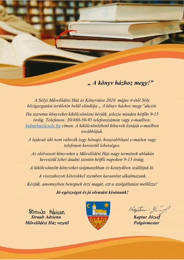 Ha szeretne könyveket kikölcsönözni kérjük, jelezze minden hétfőn 9-15 óráig. Telefonon: 30/460-50-95 telefonszámon vagy e-mailben: kulturhaz@soly.hu címen.