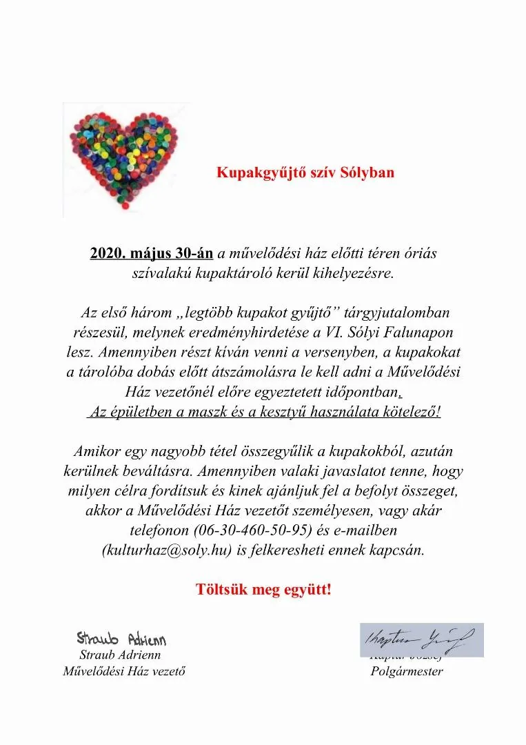 2020. május 30-án a művelődési ház előtti téren óriás szívalakú kupaktároló kerül kihelyezésre.