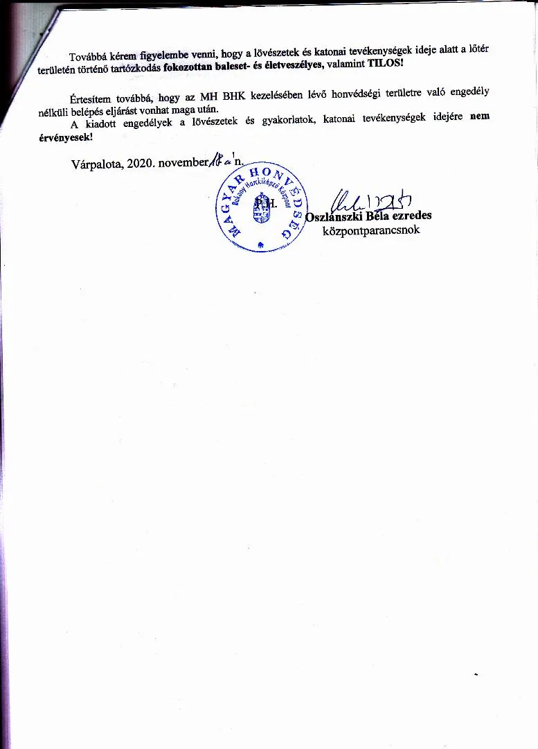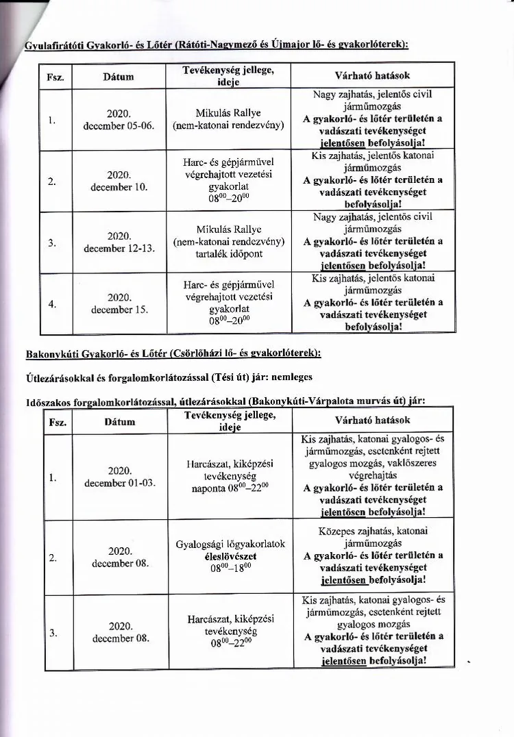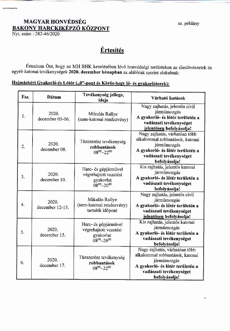 BAKONY HARCKIKÉPZŐ KÖZPONT honvédségi területein az éleslövészetek és egyéb katonai tevékenységek alakulása.