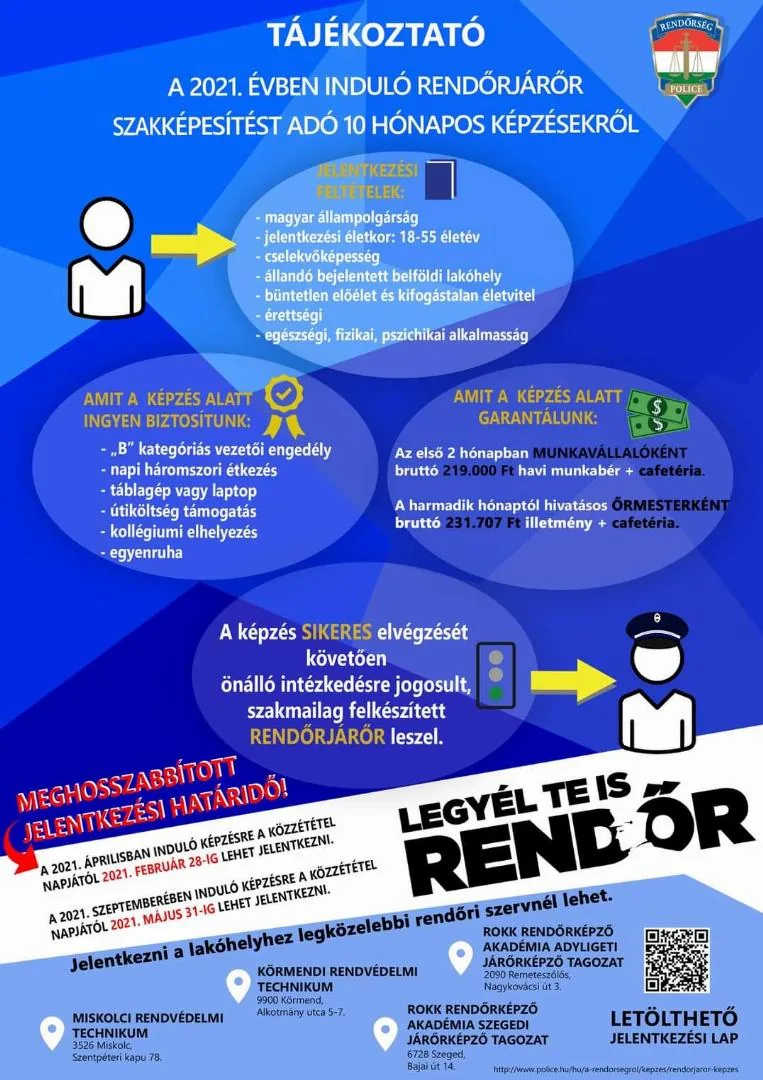 A 10 hónap időtartamú képzésünkre történő jelentkezéssel élethivatást is választasz, és leendő szolgálati helyeden változatos szakterületeken teljesíthetsz majd szolgálatot! A Rendőrséggel hosszú távra tervezhetsz, még akkor is, ha most nem ez lebeg a szemed előtt.