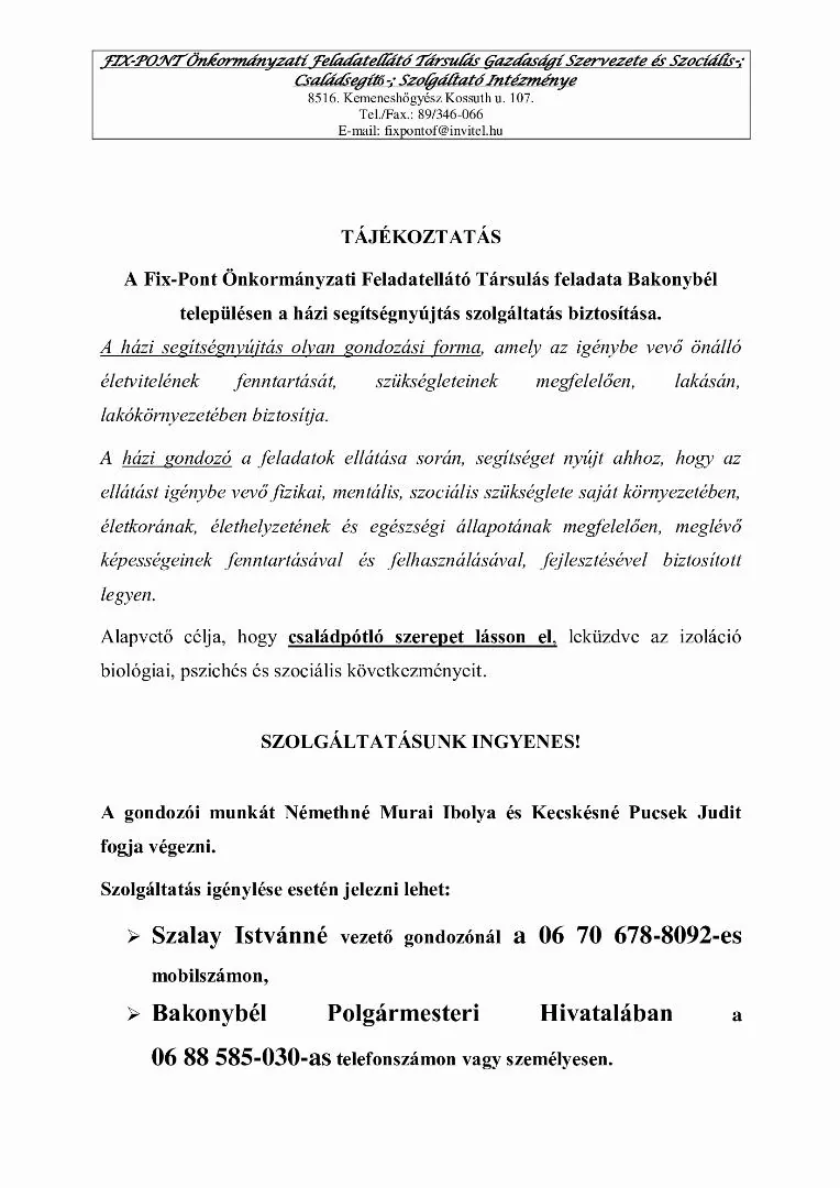 Szolgáltatás igénylése esetén jelezni lehet: Szalay Istvánné vezető gondozónál a 06 70 678-8092-es mobilszámon, vagy Bakonybél Polgármesteri Hivatalában a 06 88 585-030-astelefonszámon vagy személyesen.
