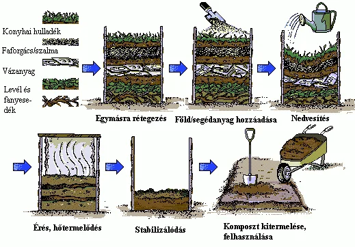 Tilos a komposztba keverni gombás betegségekkel vagy vírussal fertőzött növényi részeket. Végül - természetesen - nem való a komposztba a szervetlen hulladék (konzervdoboz, üveg, műanyag, papír, szénsalak stb.), mert ezek nem bomlanak el. A komposzthalmot körülbelül 1,5 m magasságig halmozzuk fel, majd vékony földréteggel fedjük be. A szerves hulladék - különösen, ha állandóan gondoskodunk nyirkosan tartásáról - 3-4 hónap alatt bomlásnak indul. Ekkor keverjük át a komposztanyagot.