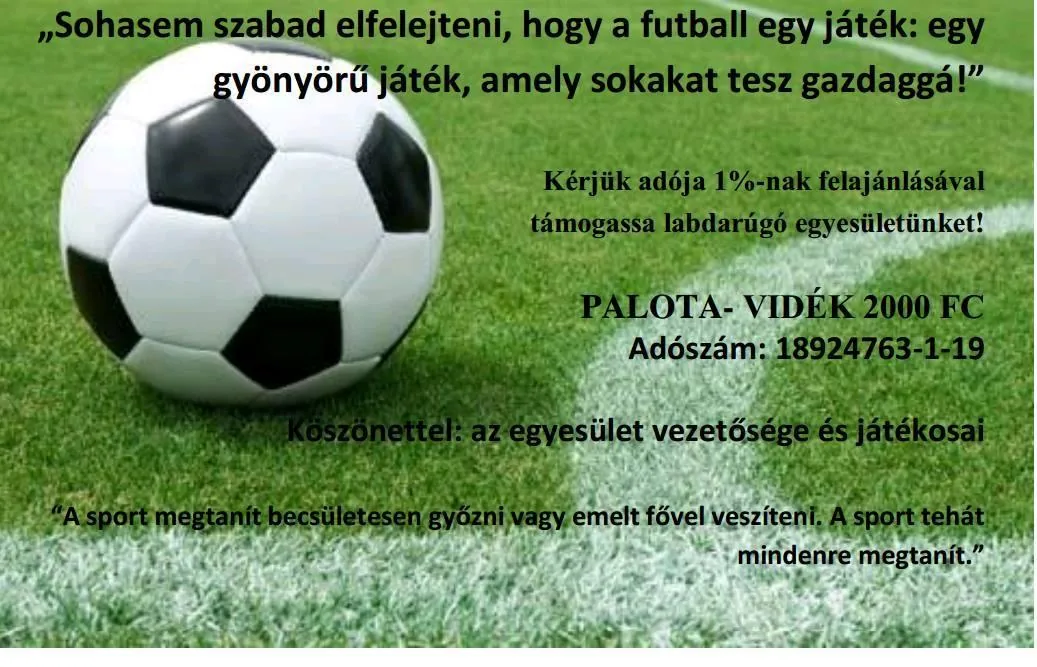 Kérjük adója 1 % -nak felajánlásával, támogassa labdarúgó egyesületünket! Palota-Vidék 2000 FC Adószám: 18924763-1-19